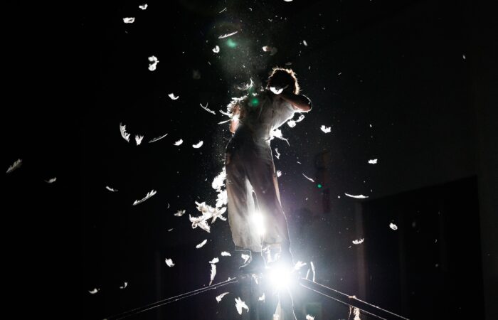 En un formato de conferencia plástica corporal (que mezcla circo, texto, plumas, agua y yeso) Ángela nos invita a entrar en su taller hacernos participes este VIAJE.